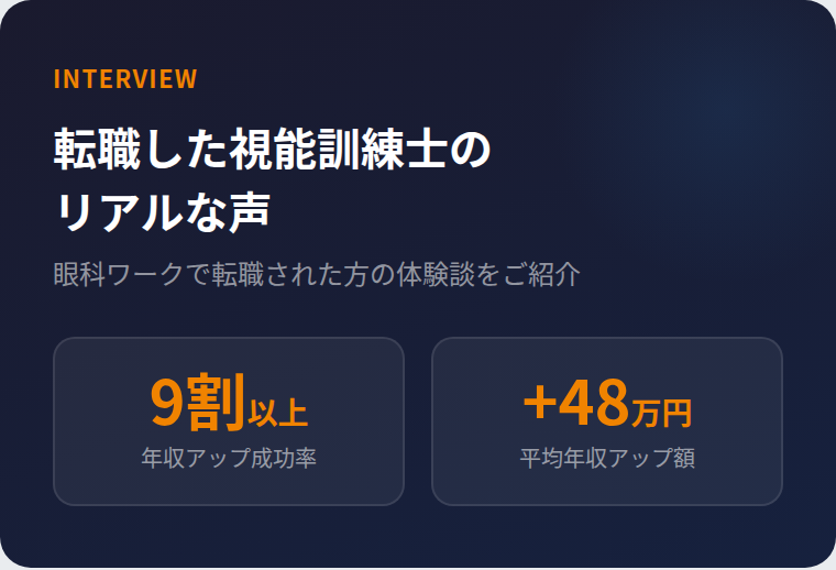 さらに眼科ワークの転職データでは、転職者の9割以上が年収アップに成功し、平均アップ額は約48万円(2023〜2026年・首都圏)。正しい職場を選ぶことで、年収は大きく変わります。